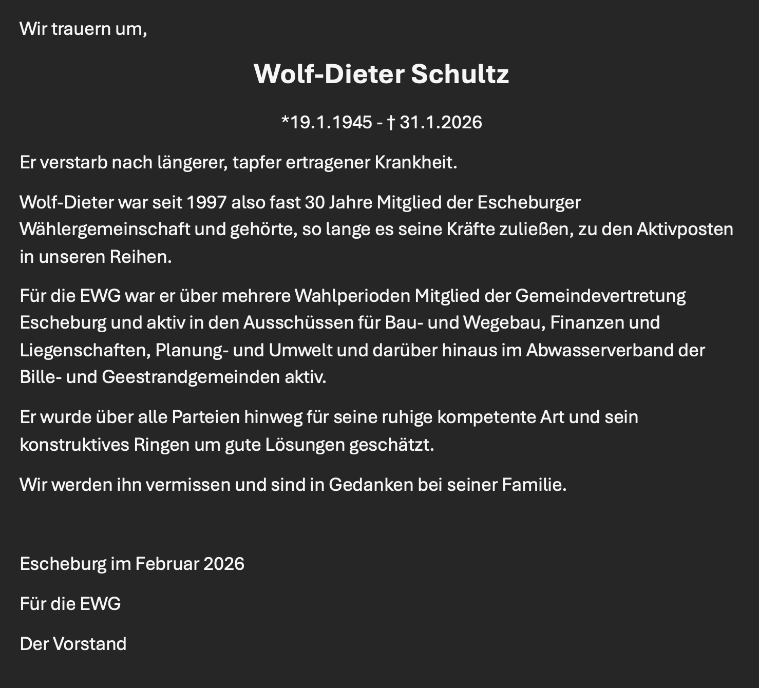 Auch in diesem Jahr hat unser „Punsch am Tannenbaum“ am Freitag vor dem 1. Advent den Start in die Weihnachtszeit markiert. Zahlreiche Escheburgerinnen und Escheburger nutzten die Gelegenheit, auf dem Dorfplatz bei Punsch, Apfelwein, Wurst und Kuchen miteinander ins Gespräch zu kommen und vertraute Gesichter wiederzusehen. Solche Abende zeigen, wie lebendig unser Dorf ist – und wie viel Herzblut darin steckt. Denn hinter vielen schönen Momenten in Escheburg stehen Menschen, die ihre Freizeit in den Dienst der Gemeinschaft stellen: im Verein, bei der Feuerwehr, in der Kirchengemeinde, in Initiativen für Jung und Alt oder in der Gemeindepolitik. Ehrenamt heißt, Verantwortung zu übernehmen, mit anzupacken und oft im Hintergrund zu wirken, ohne großen Applaus und ohne Bezahlung. Doch ohne dieses Engagement gäbe es weniger Begegnung, weniger Unterstützung in schwierigen Situationen und weniger Gemeinschaftsgefühl. Jeder Beitrag zählt – ob bei der Organisation von Festen wie „Punsch am Tannenbaum“ und Osterfeuer oder im stillen, regelmäßigen Einsatz das ganze Jahr über. Wer eine Idee hat, wie unser Dorfleben noch bunter, gerechter oder attraktiver werden könnte, bekommt dafür jetzt Rückenwind: Die AktivRegion Sachsenwald-Elbe ruft alle Bürgerinnen und Bürger auf, neue Projekte für ihre Gemeinde anzustoßen – für die Dorfgemeinschaft insgesamt, für bestimmte Gruppen oder einzelne Bereiche. Gefördert werden kleine Vorhaben mit einem Gesamtwert von bis zu 20.000 Euro. Die Finanzierung erfolgt aus Mitteln der Gemeinschaftsaufgabe „Verbesserung der Agrarstruktur und des Küstenschutzes“ (GAK); bis zu 80 % der Kosten können übernommen werden, die Auszahlung erfolgt nach Abschluss des Projekts. Aus einer Idee kann so mit überschaubarem Eigenanteil ein sichtbares Plus für Escheburg werden. Unser Dank gilt allen, die sich bereits engagieren – und allen, die darüber nachdenken, es künftig zu tun. Eine starke Dorfgemeinschaft entsteht dort, wo viele mitmachen, Verantwortung teilen und einander unterstützen. Wir wünschen Ihnen und Ihren Familien ein frohes, friedliches Weihnachtsfest – EURE EWG Den ganzen Durchblick findet ihr hier.